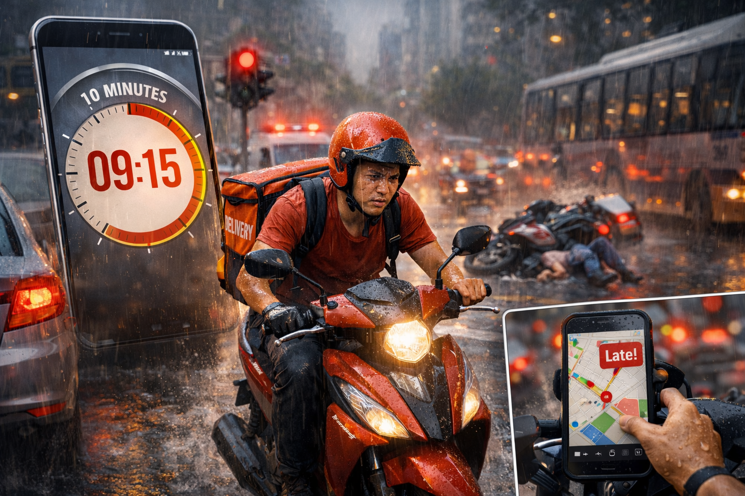 शहरी इलाकों में डिलीवरी से जुड़े सड़क हादसों में पिछले कुछ वर्षों में तेज़ बढ़ोतरी देखी गई है। इनमें से बड़ी संख्या उन मामलों की है जहाँ राइडर जल्दी में था। लेकिन इलाज और नुकसान की भरपाई ज़्यादातर खुद राइडर को करनी पड़ती है क्योंकि वह कर्मचारी नहीं, डिलीवरी पार्टनर कहलाता है।