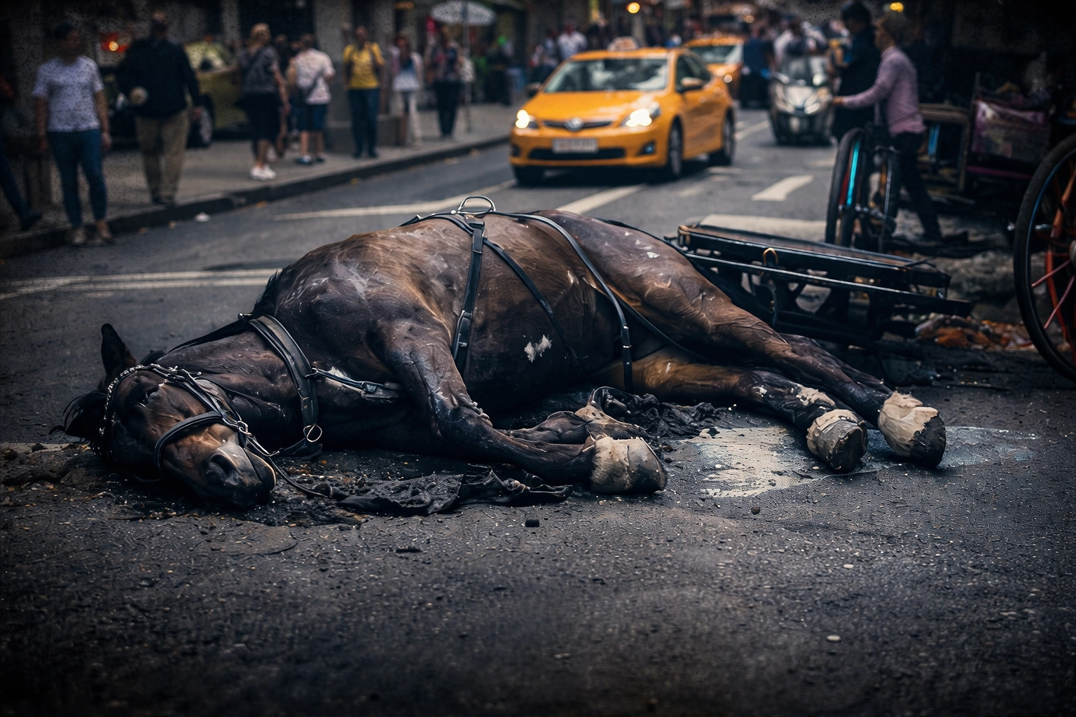 His name was Ryder. He was a carriage horse in New York City, a grey, broad-shouldered animal who spent his days hauling tourists through the streets of Hell’s Kitchen in the August heat of 2022. On one of those days, in full view of passersby and their cameras, Ryder collapsed on the tarmac. He lay there in his harness, in the middle of a Manhattan street, while traffic moved around him and onlookers photographed his body. He died where he fell. His owners mourned him. His union defended the industry. His city, the self-appointed capital of the civilised world, did nothing. His death became a viral moment for four days, then disappeared. And the carriages kept rolling.
