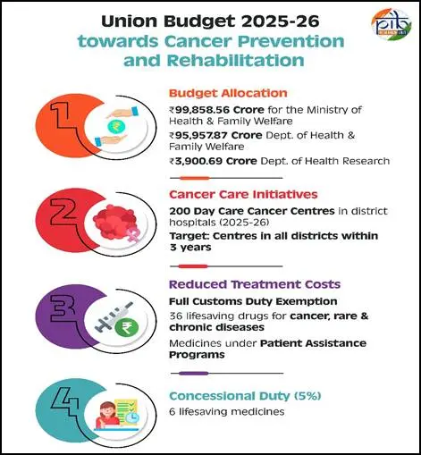 The Union Budget 2025-26 highlights the government’s commitment to cancer care. The Ministry of Health and Family Welfare received ₹99,858.56 crore, with ₹95,957.87 crore allocated to the Department of Health and Family Welfare and ₹3,900.69 crore to the Department of Health Research.