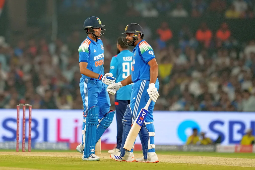India began their chase assertively with openers Rohit Sharma and Shubman Gill (60 off 52 balls, 9×4, 1×6) stitching together a 136-run partnership, their sixth century stand together. However, Virat Kohli (5) fell cheaply to Adil Rashid, who dismissed him for the fourth time in ODIs.