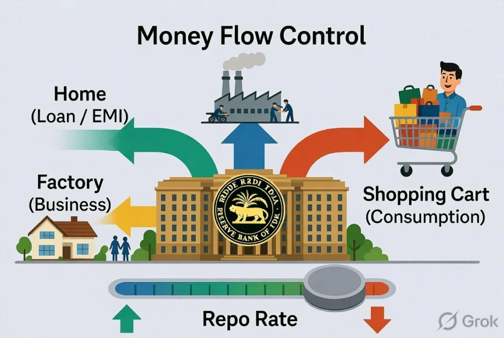 When the RBI wants to encourage borrowing and spending in the economy, it lowers the repo rate. This makes loans cheaper for banks, which in turn reduces interest rates on home loans, car loans, personal loans, and business credit. On the other hand, when inflation is rising too fast, the RBI may keep the repo rate steady or raise it to make borrowing more expensive, thereby cooling down demand and prices.