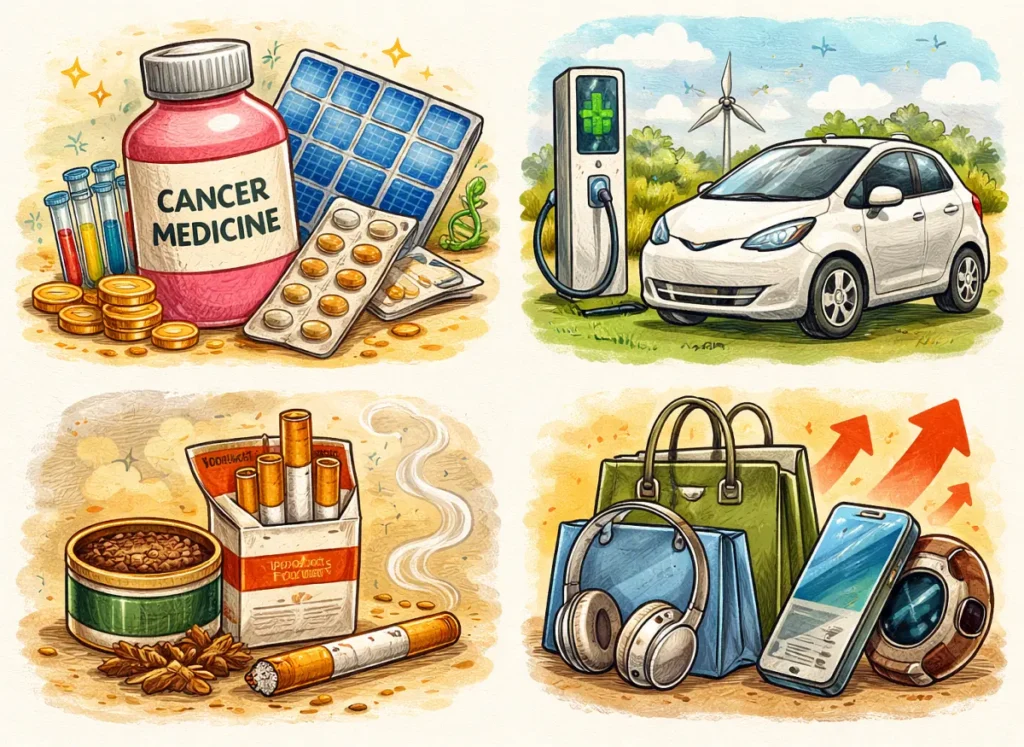 | Luxury imports (high-end consumer goods) | Duties unchanged or selectively up | Premium watches, perfumes, gadgets costlier |