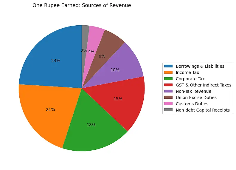 Let us break that one rupee down. Where it comes from. And where it goes. The numbers are based on the official Budget documents and follow the standard rupee-by-rupee presentation used by the finance ministry.