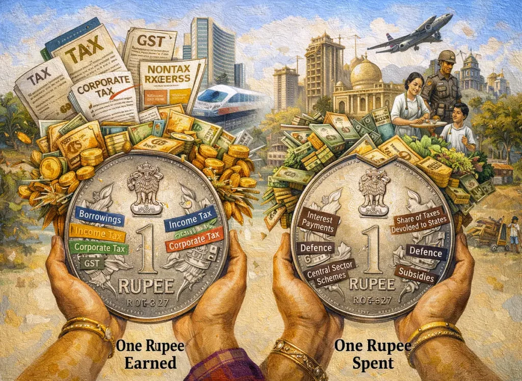 Every Budget boils down to one basic question that every household asks quietly: sarkar ka paisa aata kahan se hai, aur kharch hota kahan hai? Behind all the speeches and headlines lies simple arithmetic. The central government earns one rupee. Then it decides how to spend that rupee.